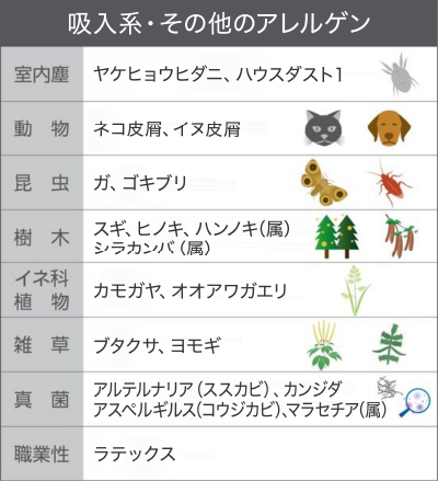 ハウスダスト1、アスペルギルス、カンジダ、ラテックス、ダニミックス(コナヒョウヒダニ、ヤケヒョウヒダニ)、イヌ・ネコ皮屑ミックス(イヌ皮屑、ネコ皮屑)、カビミックス(アルテルナリア、ペニシリウム、クラドスポリウム) |